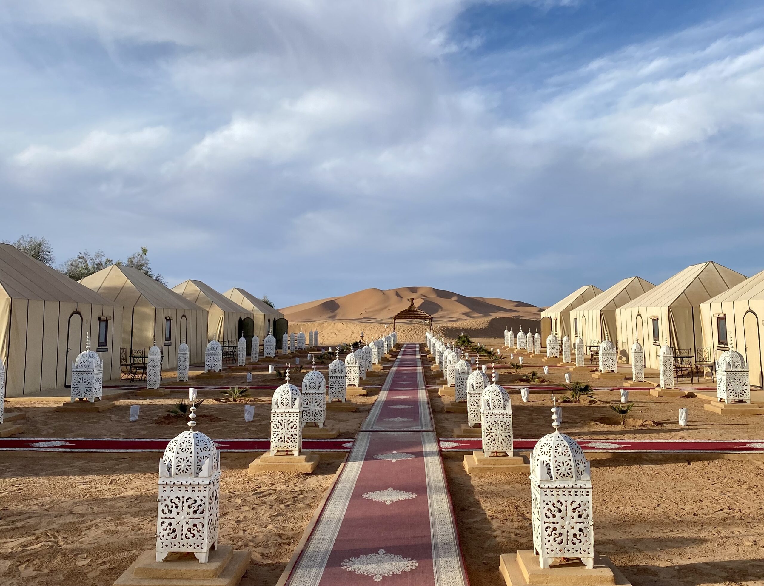 Experimente el mejor camping de lujo en el desierto del Sahara marroquí con nuestro exclusivo campamento. Nuestras tiendas de campaña están elegantemente amuebladas para proporcionar la máxima comodidad, ofreciendo una variedad de tamaños de cama que incluyen camas king, dobles, twin o individuales. Cada tienda cuenta con baño completo con una ducha de tamaño completo con agua caliente y fría, un lavabo y un inodoro para su comodidad. Nuestro dedicado personal en el campamento se compromete a garantizar que su estancia sea inolvidable, siempre disponible para ayudar y mejorar su experiencia en el desierto.